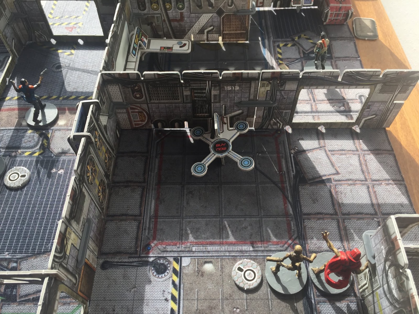 Turn 5 proved to be a huge moment. My relative inexperience - this is only my second game - meant that I was too relaxed about Renton's situation. I should have ignored the weapons crate and had him reunite with Jace and Lars in the centre of the board to cover them. That might have made a difference.